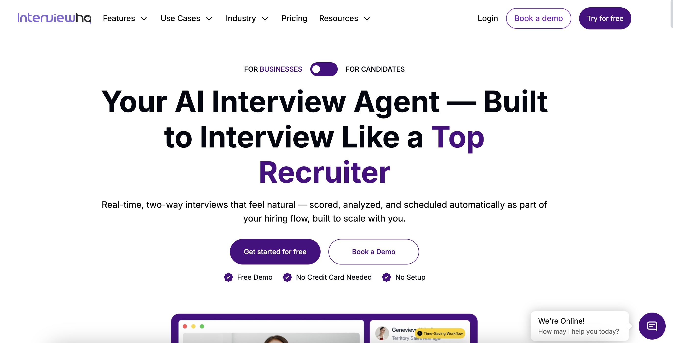 AI-powered interview platform that enables businesses to assess candidates through structured, automated interviews while also helping job seekers prepare through realistic simulations and feedback